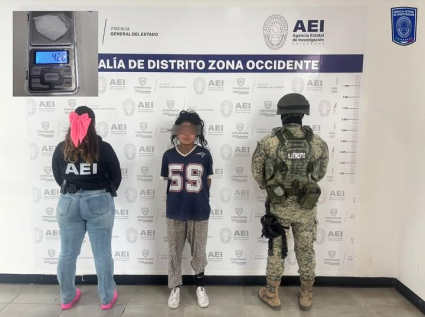 Cuauhtemoc.- El Operativo Conjunto en el que participan elementos de la Agencia Estatal de Investigación (AEI) y personal del Ejército Mexicano, detuvo en flagrancia a una mujer en posesión de la metanfetamina conocida como cristal.